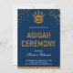 Convite elegante aqiqah que apresenta uma bela coroa dourada e uma tipografia vibrante contra um fundo azul. Basta adicionar os detalhes do seu evento neste modelo fácil de usar para torná-lo um convite de tipo único. Sacudir a placa para revelar um padrão falso de faixas de brilho dourado na parte traseira da placa.
