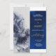 Um convite estilizado feito de azul escuro e leite claro, mármore de marrã. Este convite é apresentado por um claro contraste entre o lado esquerdo, que tem sombras azuis escuras e claras misturadas com linhas de ouro maravilhosas, e o lado direito, que tem um fundo de textura azul escura com escrevendo em branco e ouro.