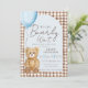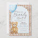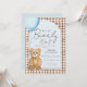Organize a festa de baby shower do tipo We Can Bearly Wait mais doce com este adorável convite de urso em aquarela. Um arco de creme marfim suave emoldura os detalhes da sua festa, enquanto um ursinho de pelúcia fofo segurando um balão azul adiciona charme e doçura. O fundo apresenta um padrão xadrez gingham marrom-chocolate, dando ao design uma sensação aconchegante e atemporal.