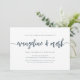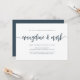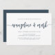 Um convite simples e elegante para festas de noivado modernos mostra seus nomes na tipografia de scripts de caligrafia manuscritos. Personalize com seus detalhes de festa de noivado abaixo. Um design moderno de marinho empoeirado azul e branco para celebrações elegantes do noivado.