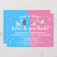 Azul ou rosa? O que você acha? Gênero único revela convite de festas com ilustrações bonitinhas de cegos dando um bebê para uma festa surpresa de bebês ou de revelação de gênero de meninas. Personalize-o com os nomes dos futuros pais, os detalhes da parte, as informações de RSVP e o nome do registro.