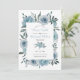 Flores azuis e poeirentas flores de aquarela floral convite para o casamento. Este belo design inclui um quadro floral feito de flores azuis empoeiradas e folhas suculentas verdes e seu texto. Os nomes estão na tipografia de scripts. O dorso é de cor azul sólida.