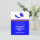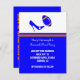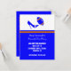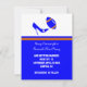Anúncio divertido de casamento de futebol "Save the Date" feito em azul real, laranja e branco. Gráficos de um salto alto de stiletto azul real chutando uma bola de futebol azul real e laranja decoram a parte superior branca do cartão. A parte inferior do cartão é feita em azul real com uma faixa laranja perto do topo e texto branco personalizado pronto para personalizar, com as informações do seu casamento. Um verso azul real tem texto laranja correndo lateralmente e lendo "Save The Date". Ótimos anúncios de "Save The Date" para o casal fã de futebol.