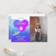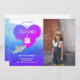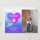 Um convite para a celebração de aniversário de um miúdo com tema de tubarões. Um pequeno personagem de tubarão olha para um coração roxo rosa que tem picadas tiradas dele. A foto é uma modelo e deve ser trocada por você. <i>Fotografia © Storytree Studios, Stanford, CA</i>