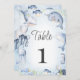 Blue under the Sea Boys Chá de fraldas Table Number Sweet sob o número da tabela de chás de fraldas do menino do templo mar com várias criaturas marinhas e algumas algas marinhas.