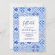 Este design rústico apresenta um padrão de fundo de azulejos portugueses, azulejos, de cor azul e branca. Personalize-o com o nome de convidado de honra em um elegante script de escrita manual azul marinho e o texto restante em serif azul marinho em um retângulo branco. Um padrão de azulejo correspondente aparece no lado oposto.