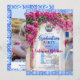 Desenho de festa temática Mamma Mia da ilha grega pintado com aquarela com flores de bougainville magenta rosa e azulejos mediterrâneos azuis.