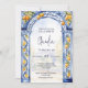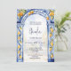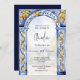 Azulejos italianos da Majolica Azul arca com limões festa de aniversário convite para descarregamento instantâneo, arco de maré azul-d-água e citros com paisagem italiana clara no fundo, tema azul-marinho, branco e amarelo.