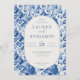 Celebrate your union with elegance and serenity through our “Azure Blooms” collection—where vibrant blue toile patterns meet refined design to bring your wedding vision to life. This collection features an elegant style with a cohesive blue toile floral theme, perfect for weddings. The artwork is characterized by intricate botanical designs in varying shades of blue and white, creating a sophisticated and timeless look. Recurring motifs include lush flowers and foliage, which adorn various items such as invitations, tableware, wine labels, menus, and thank you cards. These elements are meticulously arranged to evoke a sense of romance and refinement. The versatility of the design allows it to be applied across multiple product types, ensuring a harmonious aesthetic throughout the wedding celebration.