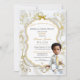 Bebê de terno branco e dourado. O fundo do convite é o cetim branco, o filigre dourado, uma moldura dourada e prateada e um embelezamento do arco. A parte de trás é enfeitada com padrão de flores douradas e fita dourada sobre fundo branco de cetim.