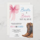 "Baby gender reveal invitation featuring a split design with a pink bow on the left and a pair of cowboy boots on the right. Text reads 'Boots or Bows: What Will Baby Be?' Invitation details with names 'Arieta and Richard' in blue and pink fonts. Background has a marble texture."