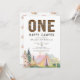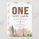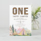 Este divertido convite rústico tem uma madeira chamada "ONE" e um campista feliz. O fundo tem uma floresta aquosa, montanhas e paisagem. Ele é acabado pelos itens de acampamento de unicórnio rosa e arco-íris que incluem uma tenda e uma lareira. A parte de trás tem um padrão do mesmo estilo de unicórnio rosa.