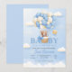This baby shower design features a soft watercolor hot air balloon made of pastel blue and cream balloons, carrying a sweet teddy bear with a delicate bow. Surrounded by fluffy clouds and a smiling star, the airy sky background creates a calm and heartwarming atmosphere. The gentle color palette and hand-painted style make this design perfect for welcoming a baby in a dreamy, cheerful way. Fully editable text allows easy customization while keeping a clean and timeless look.