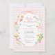 The invitation features a delightful soft pink gingham background, creating a serene and inviting canvas that evokes the timeless charm of a cozy country gathering. At the heart of the design is an elegant oval frame, adorned with a graceful pink bow. This sophisticated detail adds a touch of femininity and whimsy, perfectly framing your baby shower details with style.