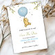 "Baby shower invitation featuring a cute bear holding a blue balloon, surrounded by stars and leaves. Text reads: 'A little hunny is on the way!' and 'Save the Date for the baby shower of Sophia and Richard, Aug 12, 7 PM.'"