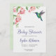 Front of a baby shower invitation with pink flowers and a hummingbird at the top. Text invites guests to an event for Sophia Robinson. The back is plain.