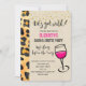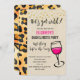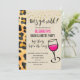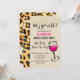 Convite de festas para uma festa de solteira com uma impressão animal selvagem e um copo de vinho legal com um esboço preto grosso e cheio de vino rosa quente. Dourada brilha no topo do design. Personalize com suas informações de solteiro em um fundo de estilo de pergaminho brando. O vamos fica selvagem, e o último fling antes do anel escrito em uma fonte de tendência legal.