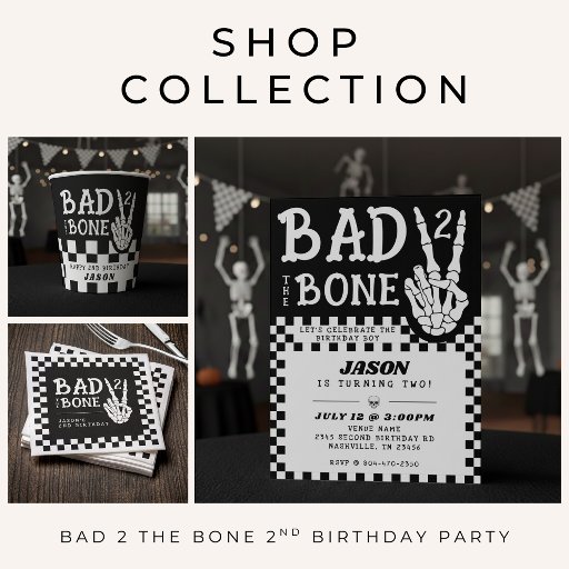 Celebrate your little girl's second trip around the sun with this Bad 2 the Bone 2nd birthday party invitation. Designed in classic black and white checkerboard with hot pink highlights and a skeleton hand making a peace sign, this invitation is perfect for highlighting your wild ride through the terrible twos. Personalize it with your event details for a party that will be two good to be true!