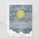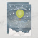 Um convite de chá de fraldas com uma cor azul-escura inspirado em fundo com texto branco cercado por estrelas e ilustrações de balão e nuvens de ar quente verde. Personalize com detalhes da sua ocasião.