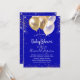Um fundo azul real. Decorado com brilho sujo de ouro, faíscas e balões. Personalize e adicione um nome e detalhes da parte. O nome é escrito com um script de estilo manuscrito.