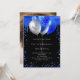Um convite de aniversário de 18 anos (ou qualquer idade) feminino e delicado. Na frente: Um fundo preto chic. Decorado com respingos de tinta azul real, efeito de gotejamento e balões. Personalize e adicione um nome e detalhes da festa. O nome é escrito com um estilo de letra à mão