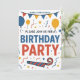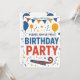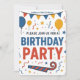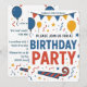 Prepare-se para celebrar com este convite de aniversário brilhante e alegre! O design apresenta uma faixa divertida de bandeiras, balões flutuantes e uma chuva de confetes coloridos. Com um texto em negrito que diz "POR FAVOR, VENHA CELEBRAR CONOSCO UMA FESTA DE ANIVERSÁRIO", este cartão define um tom divertido e festivo. É perfeito para o aniversário de qualquer criança e é fácil de personalizar com o nome, idade e todos os detalhes da festa.
