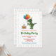 A ilustração original do desenho animado de Destei de um dinossauro verde T-rex / Tyrannosaurus Rex que está segurando um conjunto de quatro balões coloridos de aniversário. As cores são vermelho, azul, verde e laranja. O dinossauro também está vestindo um chapéu de aniversário colorido e há um bolo de aniversário marrom com quatro velas ao lado do dinossauro. A cor de fundo é branca com um padrão divertido de bolinhas coloridas que combinam com as cores dos balões de aniversário. O texto da amostra é feito com cores diferentes criando um convite de aniversário colorido, todos juntos.