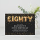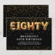 Convite de aniversário de 80 anos moderno com um fundo preto elegante, uma chuva de confetes dourados, balões de hélio dourados que formam a palavra "oitenta", e um modelo de texto de festa sofisticado e fácil de personalizar.