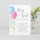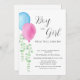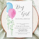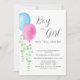 Você está planejando uma festa de revelação de gênero? Convide familiares e amigos para comemorar com este encantador convite. Apresenta balões de aquarela cor-de-rosa e azul com eucalipto e tipografia de na moda que diz "Menino ou Rapariga". Perfeito para uma festa reveladora de gênero em qualquer estação. Facilmente personalizável. Original Watercolor © Michele Davies.