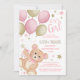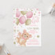 O convite para chás de fraldas de garotas bonitas, cor-de-rosa e douradas, apresenta um ursinho de peluche d'água voando em um pacote de balões com um borrifo de estrelas. Trabalho de arte por KL Stock.