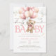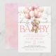 Urso de pelúcia rosa com balões podemos esperar um convite para chá de fraldas.