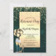 Balões elegantes, óculos de vinho, saltos altos de ouro brilhando em um fundo verde.