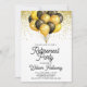 Um convite moderno e festivo para festa de aposentadoria com balões pretos e dourados, brilho dourado e tipografia de caligrafia.