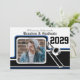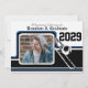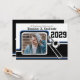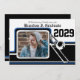 Varsity Stripe com convite de Festa de formatura Trombone com foto realçada em azul. Personalizar para qualquer licenciatura, universidade ou segundo grau. Altere o texto para o ajustado das suas necessidades. Adicionar informações ao convite de retorno também.