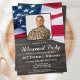 Convites de Aposentadoria Militar da Bandeira Americana - Celebre anos de serviço dedicado e convide amigos e familiares para a sua festa de aposentadoria militar com este Convite de Aposentadoria com Bandeira Americana - design da bandeira dos EUA em madeira rústica. Este convite de aposentadoria militar também é perfeito para convites de formatura militar, convite de aposentadoria da polícia, alterar local na personalização. Veja nossa coleção de presentes de aposentadoria militar, presentes de formatura, brindes e suprimentos. COPYRIGHT © 2021 Judy Burrows, Black Dog Art - Todos os Direitos Reservados. Convite Personalizado de Aposentadoria Militar com Foto da Bandeira Americana