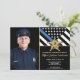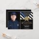 Este design apresenta uma bandeira da força policial com listras pretas e brancas, e uma faixa da linha azul fina também. O distintivo policial e o texto em ouro ficam acima de todos os detalhes da festa para a aposentadoria do oficial de aplicação da lei, xerife, capitão ou chefe. Personalize ainda mais este design com a foto do oficial de polícia que se aposenta.