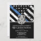 Este design apresenta uma bandeira de força policial com listras pretas e brancas e uma faixa fina azul também. O distintivo da polícia e o texto prateado ficam acima de todos os detalhes da festa para o oficial de aplicação da lei que se aposenta, xerife, capitão ou chefe detalhes da festa de aposentadoria.