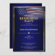 Gloriosa bandeira americana ondulando contra um fundo azul escuro. Um modelo de festa de aposentadoria elegante que é simples de editar. Este design elegante é adequado para veteranos, militares, policiais, empregos relacionados ao governo ou empregos relacionados ao patriotismo.