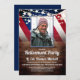Modelo clássico de foto de um design vermelho, branco e azul de bandeira dos EUA com luzes de festas de cordas celebratórias para esses convites de festas de aposentadoria militar que você pode personalizar para sua próxima celebração.