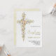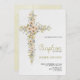 Baptism invitation card featuring a floral cross with pastel flowers. Text invites to baptism of Joseph and John. Soft, elegant, and serene tone.