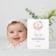 A modern and elegant baptism thank you card. A chic white background decorated with a watercolored pink and ivory floral wreath, a bow and a golden cross. Personalize and add your photo of the child, thank you note and name.