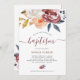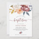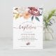 Este convite na moda do baptismo caracteriza um buquê floral da aguarela bonita, com flores e folhas nas máscaras de Borgonha, de pêssego, de cinzas azuis, de branco, e do ouro amarelo. A tipografia moderna do roteiro adiciona um toque à moda. Este convite do baptismo é especialmente perfeito para celebrações de Borgonha, rústicas, e de outono.