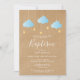 Perfeito para convidar amigos e familiares para um batismo batizado especial. Com nuvens azuis fofas e estrelas douradas em cordas, em um fundo kraft rústico. Adicione os detalhes da sua celebração em branco para criar o convite perfeito.
