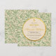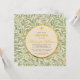 Este elegante convite de batismo botânico e gênero-neutro tem um padrão de folhas de salgueiro verdes no fundo e no verso. O texto está em um círculo que tem a cor de papel antigo e bordas de folha de ouro falso. Há uma cruz de ouro (falso) acima do texto. O nome está escrito em uma fonte caligráfica elegante dourada, o restante em letras maiúsculas; a ocasião também está escrita em letras douradas, o restante do texto em preto.