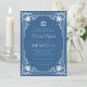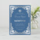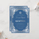 Este convite de bar mitzvah azul e prata, clássico e elegante, com um ar vintage, tem uma moldura ornamentada em falso papel alumínio com elegantes decorações cinza prateado barroco sobre um fundo azul clássico. Acima do texto há uma estrela de David em falso papel alumínio. Exceto pela ocasião "Bar Mitzvah", que também está em falso papel alumínio, todo o texto pode ser personalizado e tem uma cor cinza prateado semelhante à moldura de falso papel alumínio.