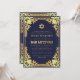 Este convite de bar mitzvah azul-marinho elegante com barra de ouro tem uma moldura ornamentada em falso ouro com decorações barrocas douradas em um fundo azul-marinho. Acima do texto há uma estrela de David em falso ouro. Exceto pela ocasião "Bar Mitzvah", que também está em falso ouro, todo o texto pode ser personalizado e tem uma cor amarela dourada semelhante à moldura de falso ouro.