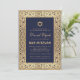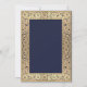 Este convite de bar mitzvah floral azul elegante com um ar vintage tem uma moldura floral dourada de decorações intricadas de rosas selvagens em um fundo azul marinho. Todo o texto pode ser personalizado e tem uma cor dourada semelhante às rosas douradas na moldura. Acima do texto, há uma estrela de David dourada. O nome da criança é escrito em uma elegante fonte caligráfica.