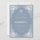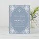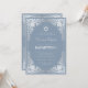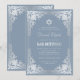 Este convite de bar mitzvah azul empoeirado e prata com um ar vintage tem uma moldura ornamentada em folha de prata falsa com elegantes decorações cinza prateado barroco em um fundo azul empoeirado. Acima do texto há uma estrela de David em folha de prata falsa. Exceto pela ocasião "Bar Mitzvah", que também está em prata falsa, todo o texto pode ser personalizado e tem uma cor cinza prateado semelhante à moldura de prata falsa.