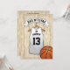 Convites de festa mitzvah casuais com um fundo de quadra de basquetebol, uma camisola branca com o nome da criança, número e a estrela de davi. No verso estão os detalhes da celebração do bar mitzvah com uma bola de basquetebol na parte inferior.