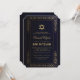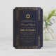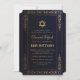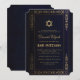 Este convite de Bar Mitzvah vintage navy e dourado tem uma moldura com decorações florais vintage intercaladas com pequenas estrelas de David nos cantos e no centro das partes superior e inferior. O fundo é azul-marinho, o texto e as decorações são dourados. Acima do texto há uma grande estrela de David dourada. O nome do menino é escrito em uma elegante fonte caligráfica, o restante em letras maiúsculas.